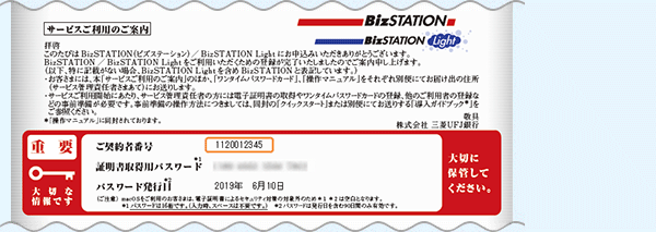 MUFG Bizログイン時にご入力いただくのは、「BizSTATIONログインパスワード(基本サービス等、他のサービスで使用するログインパスワード)」ですので、ご注意ください。
